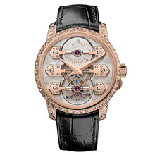 First released in 2019, the Cosmos wonderfully demonstrates Girard-Perregaux’s horological prowess. Equipped with three exceptional complications, the model encompasses technical virtuosity, uncompromising finishing and artisanal craftsmanship. Now, Girard-Perregaux has chosen to create three unique versions of this model featuring aventurine, obsidian and onyx, and, lastly, a combination of spectrolite and aventurine. These three models are the final edition of the Cosmos model and serve as a fitting swansong for this exceptional watch.